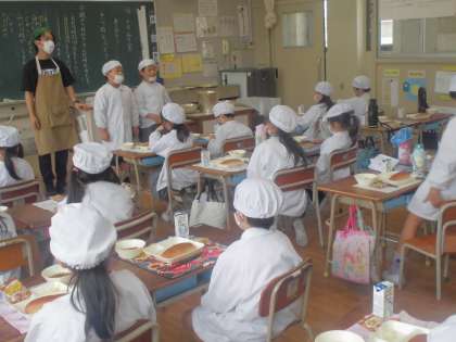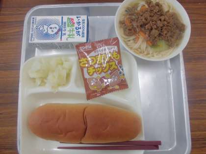 今日の給食のメニューは、担々麵、キャベツの甘酢づけ、おさつチップス、牛乳、パンでした。担々麺はチンゲンサイ、もやし、にんじんを使った汁麺に牛豚ひき肉、白ねぎ、生姜、にんにくをごま油で香りよく炒め、テンメンジャンや赤みそなどで味付けした肉みそをのせて食べます。キャベツの甘酢づけは米酢を使っていてさっぱりとした口あたりです。おさつチップスはさつまいもを揚げたものでポリポリ食べます。