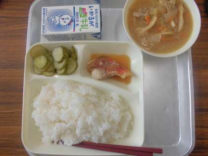 今日の給食のメニューは、赤魚の醤油だれかけ、豚汁、きゅうりのゆず風味、牛乳、ごはんでした。赤魚の醤油だれかけは身がふっくらと厚く、上品な甘さのたれがかかっていて和風仕立てでした。赤魚は魚の名前ではなく、皮の色が赤い魚のことで、代表的なものにアコウダイやアラスカメヌケなどがあります。豚汁は豚肉の旨みが十分に感じられ、野菜もたくさん入っていました。きゅうりのゆず風味は蒸したきゅうりを米酢やゆず果汁で作った調味液を和えています。
