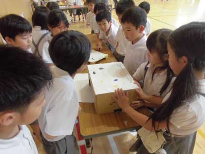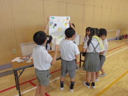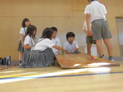 今日は2年生がおもちゃランドを作って、1年生に遊んでもらいました。2年生は自分たちが一生懸命作ったおもちゃを遊んでもらえると思って、とても張り切っていました。1年生にわかりやすいようにルール説明をしたり、お手本を見せたりしてとてもすばらしかったです。1年生は「すごい!」「なんで動くん?」とびっくりすることがいっぱいありながらも楽しそうに遊んでいました。