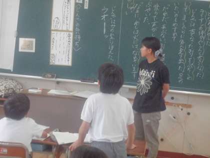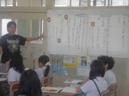 3年生の子どもたちが国語の授業で物語を読んでいます。物語を読んで登場人物の気持ちを想像しています。どのように登場人物の気持ちが変わってきたのか、まずは前の授業をみんなで振り返ります。教室の横の壁には前の授業で学習したことがまとめて掲示してあるので、子どもたちにもとてもわかりやすいですね。子どもたちはそれぞれが考えたことや思ったことを積極的に発表することができていました。ノートもしっかりと書くことができていました。運動会前でもしっかりと勉強しています。