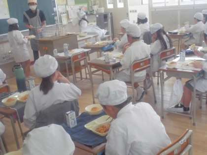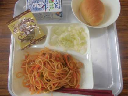 今日の給食のメニューは、イタリアンスパゲッティ、サワーキャベツ、カレーフィッシュ、牛乳、パンでした。イタリアンスパゲッティは豚肉とウインナーの他に細かく刻まれたにんじん、たまねぎ、ピーマンもたくさん入っていて、マッシュルームの食感がアクセントになっていました。サワーキャベツはさっぱりとした口あたりで、ほのかに甘酸っぱい酸味がポイントです。カレーフィッシュはいつものミニフィッシュのカレー味でさらに食べやすくなっています。