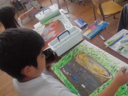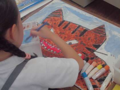 「にゃーご」は2年生の国語の教科書に載っている子どもたちが大好きなお話です。先生の注意も聞かずに遊びに出かけた3匹の子ねずみが怖いねこと出会いますが、ねこの恐ろしさを知らずに無邪気にねこに近づく子ねずみたちと、はじめは子ねずみを食べようとしていたねこが心温まるふれあいを通して互いの気持ちが変化していく様子が描かれています。子どもたちは自分が好きな場面を選んで絵に描き表わすことにしました。子どもたちが描くと教科書に載っている挿絵よりも登場人物の気持ちが伝わってくるから不思議です。