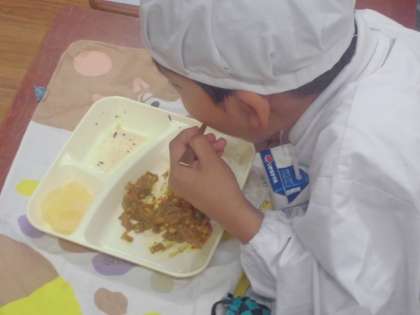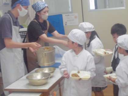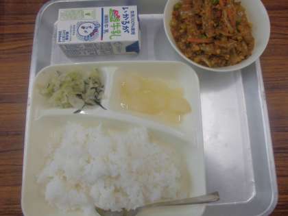 今日の給食のメニューは、大豆入りキーマカレーライス、キャベツのひじきドレッシング、和なし(缶)、牛乳でした。大豆入りキーマカレーライスは牛豚ひき肉をにんにくと一緒に香りよく炒めて、細かく刻んだたまねぎとにんじんも入れています。その他に大豆も入っていて栄養も豊富です。さらに豚レバーも入っていて、レバーには血をつくるもとになる鉄分が多く含まれています。キャベツのひじきドレッシングは米酢を使用し、さっぱりとした口あたりでした。和なし(缶)は冷たくて甘かったです。