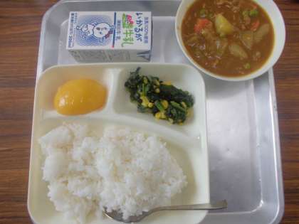 今日の給食のメニューは、ポークカレーライス、ほうれん草のソテー、黄桃(缶)、牛乳でした。ポークカレーライスはにんにくで香りよく炒めた豚肉の旨味が効いていて、まろやかなルウにつつまれたじゃがいもがやわらかくホクホクしていておいしかったです。ほうれん草のソテーは塩こしょう、しょうゆで味付けされたほうれん草にコーンが添えられていました。黄桃(缶)は冷たくてつるんと口の中にすべり込んできました。