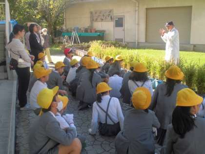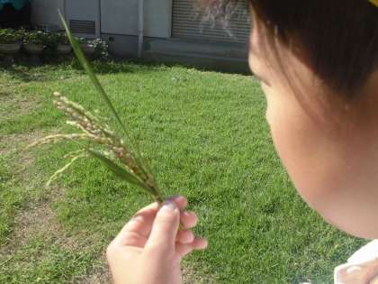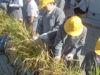 今日は5年生の子どもたちが「稲刈り体験」をしました。1学期にバケツで「田植え体験」をして稲の生長の観察も続けてきました。社会の学習でも農業について勉強し、その中には米作りも含まれています。地域の方々の協力を得ながら取り組んできて、今日はその稲刈りの日です。田んぼではなくバケツ稲なのでしっかりとした米を作ることは難しいということなのですが、それでも稲穂がしっかりとできているので雰囲気は十分に感じられます。稲刈りは本来昔のように鎌(かま)で行いたいところですが、安全面を考えてはさみで切るという形で行いました。