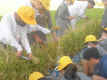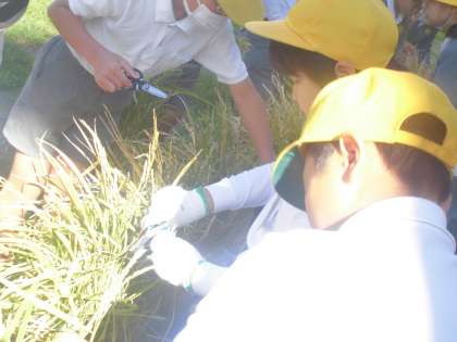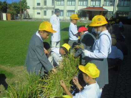 「何つぶあるんやろ?」「かぞえてみようや!」…子どもたちは「1.2.3.4.5…」とかぞえ始めますが、すぐにあきらめていました。切り取った稲穂を手にとって「これがお米かあ」「いつも食べてるごはんやんな」と今さらながらに改めてつぶやいている子もいました。大阪市のような学校ではなかなか体験することができないことですが、地域の方々のおかげで子どもたちは実際に田植えをしたり稲刈りをしたりすることができています。12月には「もちつき体験」も計画していただいています。本当にありがとうございます。
