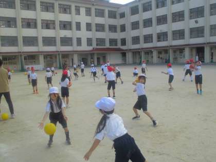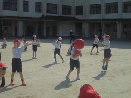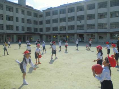 ボールを空に向かって投げたり地面に大きくはずませたり…、お友だちに向かって下から投げたり上から投げたり…、上手にキャッチすることにもチャレンジしています。2年生の子どもたちがボールを上手にあつかえるように、いろいろな動きや運動に取り組んでいました。運動会の練習も終わって普段の体育の授業風景が戻ってきました。「こんなことできるかな?」という先生の問いかけに対して、「先生できたよー」「○○さんめっちゃじょうずやで」…子どもたちの返す元気な声が聞こえてきます。