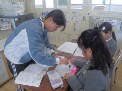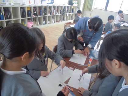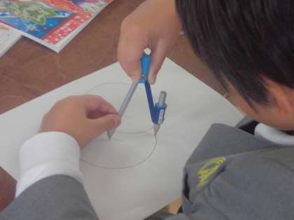 今、3年生は算数の学習で「円」について勉強しています「直径」や「半径」「中心」といった言葉も覚えました。今日はコンパスを使って「円」を描く練習です。描きたい円の半径の長さを測って中心の場所を決めて針をさします。コンパスの上部をつまんで手首を上手にひねりながら回していきます。途中で止めずに一定の力で一気にコンパスを回すのがコツです。子どもたちは何回も何回も練習していました。慣れが大切ですね。先生も一人ひとりがきちんと描けているかていねいに見て回っていました。