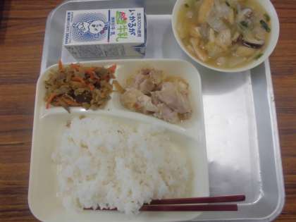 今日の給食のメニューは、鶏肉のおろし醤油かけ、うすくず汁、きんぴらごぼう、牛乳、ごはんでした。鶏肉のおろし醤油かけは香ばしく焼いた鶏肉にゆず果汁を加えたおろし醬油をかけてさっぱりした味に仕上がっていました。うすくず汁はとろみがついているので冷めにくく、具材も野菜中心にたくさん入っていました。きんぴらごぼうは豚肉が入っていたのでさらに旨みも増していました。