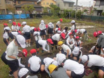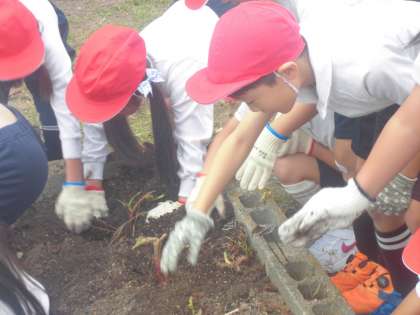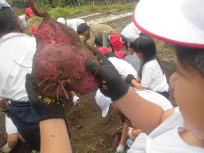 午前中に2年生の子どもたちが「いも掘り」をしました。1学期にさつまいもの苗をみんなで植えました。いよいよ今日はお楽しみの収穫の日です。子どもたちは体操服に着替えて軍手をはめてやる気満々です。「いっぱいとれるかな」「大きいのあるかな」…子どもたちは口々に話しながら、早くいも掘りがしたくてたまらない様子でした。みんながちゃんといも掘りができるように先生がそれぞれの場所もある程度決めてあげます。「さあ、たくさんできているといいね」という先生の言葉を合図に一斉にみんなで掘り始めました。