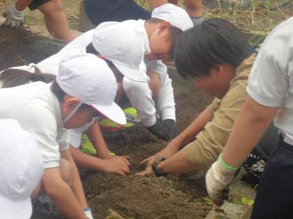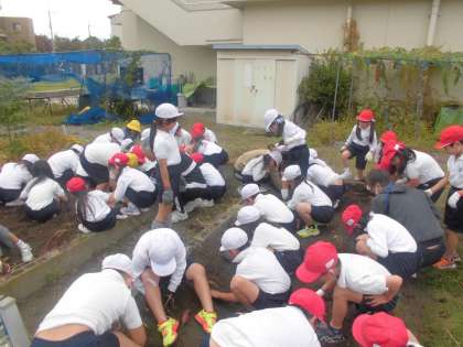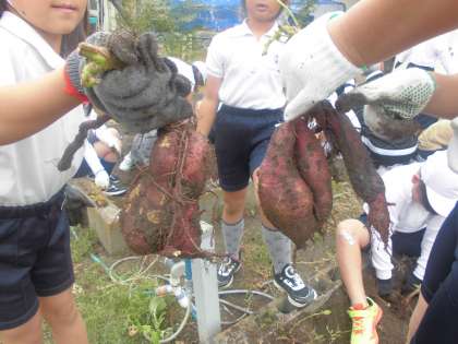 「みてみてー」「めっちゃ大きいからムリやわー」「なかなか手ごわいでー」…子どもたちの叫び声が学習園に広がります。今年はなかなかの豊作のようです。中でも大きく育っているのが目立ちます。大きいので土の中からきれいに掘り出すのにかなり子どもたちは苦労しているみたいでした。でもその分、掘り出すことができたときにはものすごく笑顔で喜んでいました。いも掘り大成功です。子どもたちは秋の味覚さつまいもを目の前にして、さっそく「これ食べるの?いつ食べるの?」と食べることばかりが頭の中にあるようでした。とても楽しい「2年生のおいも掘り」になりました。