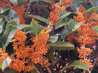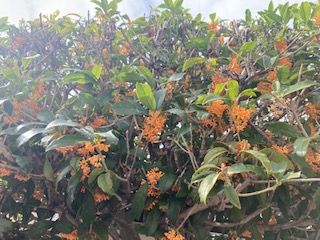 正門にある2本のキンモクセイ(金木犀)の木が花を咲かせています。キンモクセイは秋にオレンジ色の小さな十字型の花を咲かせて、甘く芳醇(ほうじゅん)な香りが周囲に広がります。香りが強いので香水やアロマにも使われてリラックス効果もあるようです。11月に入り朝晩の冷え込みも感じられるようになりましたが、毎年咲くキンモクセイの花がさらに秋の深まりを感じさせてくれています。