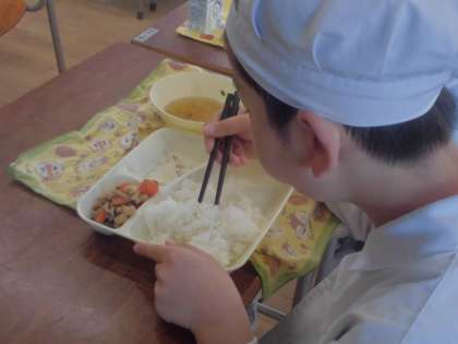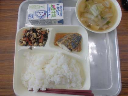 今日の給食のメニューは、さごしのごま醬油かけ、五目汁、大豆の煮物、牛乳、ごはんでした。さごしのごま醬油かけは身をふっくらと焼いたさごしに、ごまの風味を生かした甘辛い醤油仕立てのたれがかけられていました。ごはんにとてもよく合う味でした。五目汁は味に深みが感じられ、里芋と大根、白菜、玉ねぎ、しいたけ、三つ葉が入っていました。大豆の煮物は大豆の他にもひじき、うすあげ、にんじんが一緒に煮含められていて体にやさしい感じがしました。