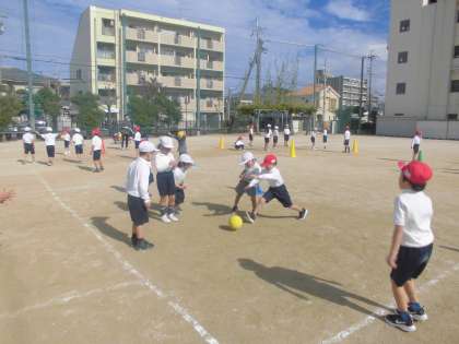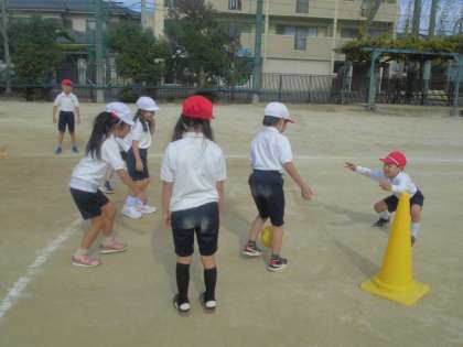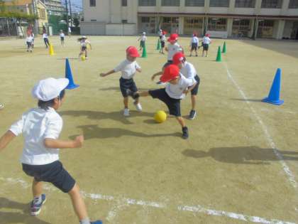「なげたらだめやんか」「ころがさないとあかんねんでー」「あたったあたったー」…1年生の子どもたちが運動場で元気にころがしドッジボールをしていました。1年生なので左右にパスを回したりすばやくボールを転がして緩急をつけたりするなどの作戦を考えることはまだできませんが、思い思いの動きをそれぞれ楽しんでいました。1年生の子どもたちは素直に思ったり感じたりしたことが言葉になって出てくるので、見ているだけでなく聞くことでもかなり楽しめますよ。