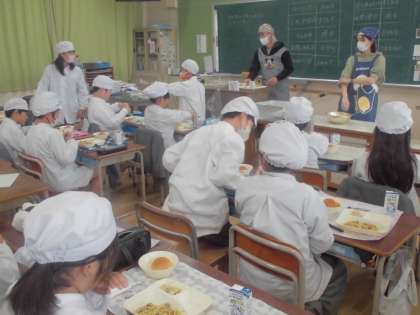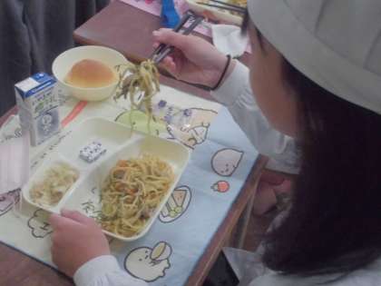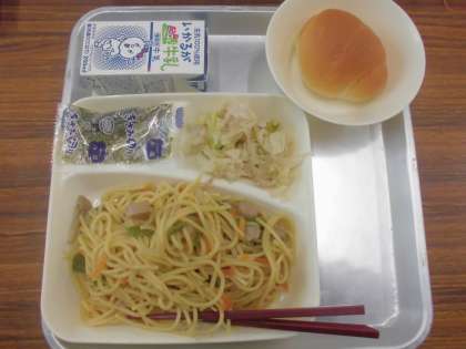 今日の給食のメニューは、ウインナーときのこの和風スパゲッティ、焼きツナキャベツ、固形チーズ、牛乳、パンでした。ウインナーときのこの和風スパゲッティはウインナーとベーコンの旨みを生かして、季節の食材のしめじとまいたけ、そしてたまねぎとにんじん、ピーマンを使って醤油ベースの和風味にととのえています。焼きツナキャベツはツナとキャベツを一緒に炒めて、シンプルですがおいしかったです。固形チーズは少し小さめのが一つです。