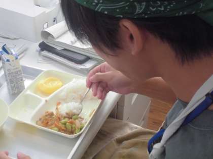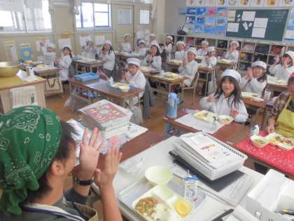 今日の給食のメニューは、ピリ辛丼、中華スープ、白桃(缶)牛乳でした。今日はどの教室の誰を「突撃昼ごはん」にしようかと思っていたところ…、たまたまそーっと先生にしてみました。いつものように後ろからパシャリ!すると子どもたちからなぜか大きな拍手が起こりました。子どもたちは私の動きをよく見ていたようです。「せんせい よかったね」「はじめてホームページにのるね」「うん よかったよかった」という感じで大きな拍手が起こったので、先生も私もちょっとびっくりしました。思いがけない子どもたちの反応に先生も思わず恥ずかしくなって手で顔をかくそうとしているところです。(3枚目)なんとものどかな教室です。