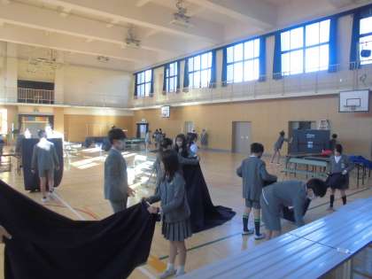 実は、年間を通して6年生は大きな行事のたびに準備と片付けをしています。入学式準備から始まり、何回目ですかねぇ。しかし、体も大きくなり、たくましく成長してきた6年生は本当に頼りになります。あっという間に片付けが終わっていきます。本当にありがとう。ご苦労様でした。卒業式の準備は5年生が行います。ここでいよいよバトンタッチということです。私が担任の時は5年生に「ずっと6年生がやってくれていたんだよ」「今日からはみんなが大道南小学校のために頑張るんやで」と話をしたものです。卒業まであと4か月です。