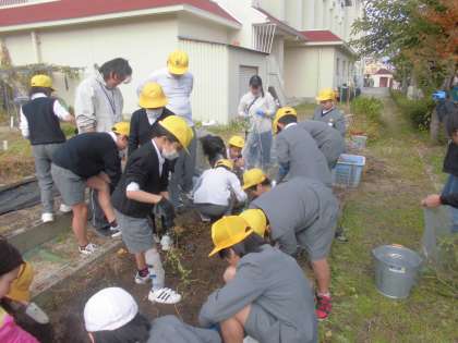 なかよし学級のお友だちみんなでいもほりをしました。「おいもさん いるかな」「おいもさん いるかな」…なぜか「おいもさん」とみんなていねいに呼んでいました。「たくさんできているといいね」…みんなで少しずつ少しずつ掘り進めていきます。「あった あった 大きいのがあったよ」「すごい すごい 大きいのがあったね」…子どもたちも先生たちもみんな大喜びです。みんなの分を掘らないといけないから大変です。みんなで協力して楽しく活動することができていました。