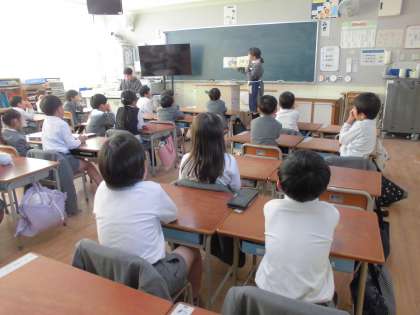 今日の1年生の図書では、図書室が5時間目使えないため、教室で図書の先生に読み聞かせをしてもらいました。