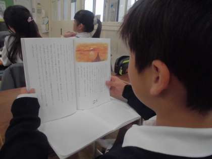 「大造じいさんとがん」は5年生の国語に載っている有名な物語です。狩人である大造じいさんと沼地に毎年やって来るがん(雁)の群れの統領の残雪(ざんせつ)との関わりに中で、大造じいさんの心情がどんどん変化していきます。その大造じいさんの心の変化はどうして起こっていくのかについて考えを深めていくところにこの物語のよさがあります。子どもたちは先生や友だちと積極的に意見を交流しながら、大造じいさんの気持ちや残雪の気持ちを考えていました。最後には子どもたちの心をも大きく揺さぶってくれるはずです。しっかりと勉強してくださいね。