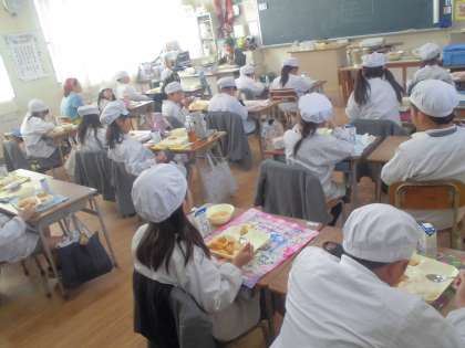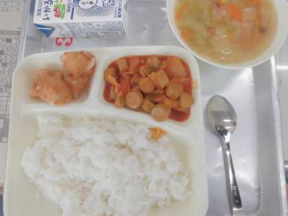今日の給食のメニューは、ケチャップライス、スープ、れんこんフライ、牛乳でした。ケチャップライスはウインナーとベーコン、たまねぎ、ピーマンを炒めて、ケチャップをメインにソース、塩、カレー粉で味付けした具をごはんと混ぜ合わせて食べます。コクが感じられておいしかったです。スープは鶏肉とキャベツ、にんじん、しめじ、コーンが入っていて彩りもきれいでした。れんこんフライはころもがサクッと揚げられていて、歯ごたえもありました。たぶんはじめてのメニューじゃないのかなと思います。