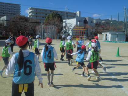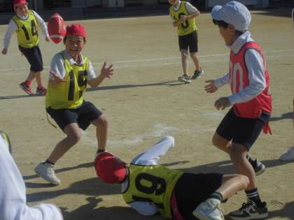 太陽の光がさしていますがやはり風が少し冷たいです。そんな中でも5年生の子どもたちが元気に運動場を走り回っています。タグラグビーです。腰につけているタグを取られないようにしながらボールを相手のゴールエリアへと運びます。タグラグビーは身体接触が禁止されているので大きなけがをする可能性が低く、子どもたちも思い切ったプレーができるので親しみやすい運動です。女子も男子に負けじと迫力あるプレーを連発していました。みんな元気いっぱいです。