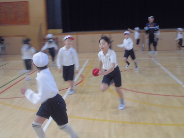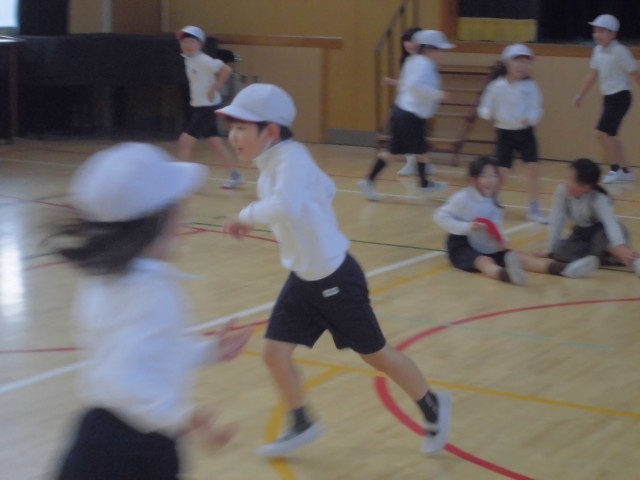 2年生の子どもたちが体育館でおにごっこをして遊んでいます。じっとしていたりかくれたりすることがない2年生の子どもたちです。常に全力で走り回ります。なかには上手にステップを踏みながらおにの子のタッチをしようと伸ばす手を巧みによけていきます。遊びを通して体を巧みに移動させる技も身につけていきます。ところせましと走り回って楽しそうな笑い声や響き渡らせていました。