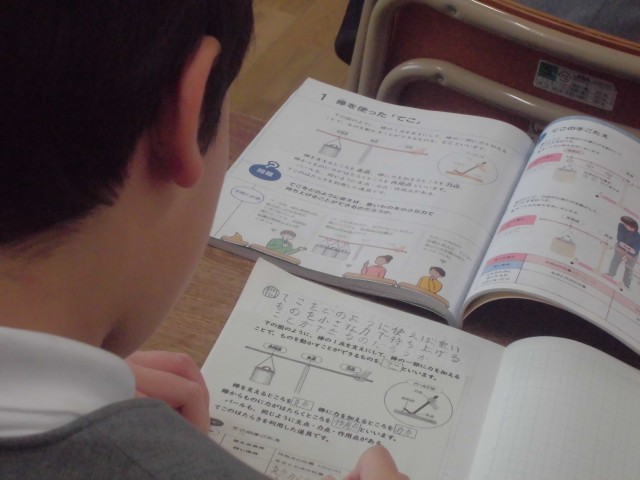6年生の子どもたちは理科の学習で3学期からは「てこ」について学習しています。棒の1点を支えにして、棒の一部に力を加えることで、ものを動かすことができるものを「てこ」といいます。支点・力点・作用点があり、てこをどのように使えば重いものを小さな力で持ち上げることができるのかを考えていきます。実際に試してみました。「うわっ重いー!」「えー何これ軽ぅ!」…同じ重さの砂袋ですが、支点・力点・作用点の位置を変えることで力の入れ具合がまったく違って感じます。「ほんまかーっ?」「うそやろー」…見ている友だちは疑っています。身の周りには「てこの原理」を使ったものがたくさんあるので、一度探してみるのも理科学習としておもしろいと思います。