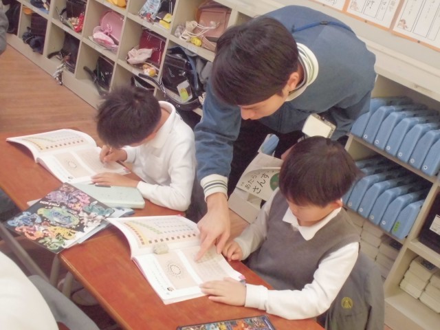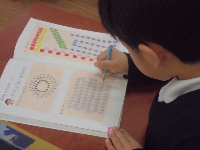 1年生の子どもたちが算数の授業で『数をかぞえよう」に取り組んでいました。かぞえるものが幾何学的に表示されていたり無造作に並んでいたりしています。一つずつかぞえることが今までのやり方でしたが、今の1年生はもう違います。簡単に素早く正しく数えていかなければいけません。そうです、10のまとまりにしてかぞえていきます。10のまとまりごとに線で囲み、視覚的にもわかりやすくしながら要領よくかぞえていきます。慣れてくると、図を見ながらどのあたりの10をまとまりにすればいいのかも自然とわかってきますね。先生も子どもたちの成長ぶりに喜んでいました。
