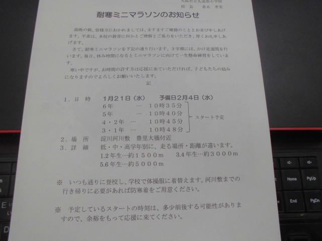 明日、1月21日(水)に淀川河川敷において、耐寒ミニマラソンを実施する予定です。