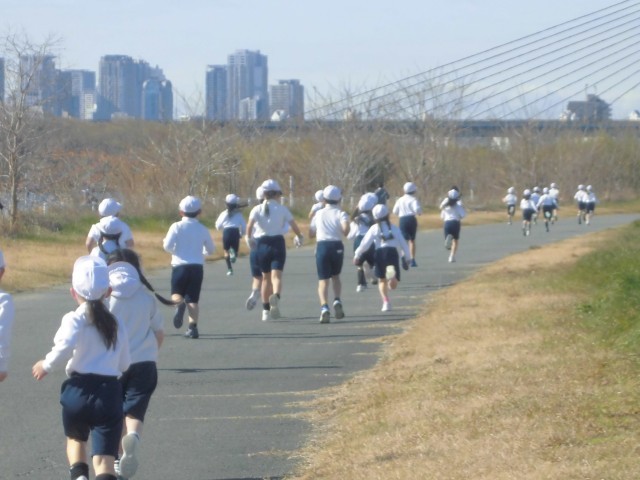 午前中に「ミニマラソン大会」を行いました。淀川河川敷で行うミニマラソン大会は大道南小学校の冬の風物詩とも言える行事で、何年も前からずっと続けられています。今までの卒業生もみんな走ってきました。子どもたちの意識の中にもミニマラソン大会は大きな行事の一つとしてしっかりと根付いています。1年生から走り始めて6年生になるまで、その時々の自分の目標をしっかりと掲げて走ります。そういう意味では子どもたちの成長の過程を十分に感じることができる行事とも言えます。1・2年生は1500m、3・4年生は3000m、5・6年生は5000mを走りました。毎年少しでも順位を上げようと自主練習をする子もいます。もちろん、走ることが苦手な子もいます。他の子と競争したり比べたりするのではなく、自分の目標として「あきらめずに最後まで頑張って走ることが大事だよ」「達成することできっとこれからの自分の自信につながるから」と背中を押すように指導してきました。どの子もそんな期待に応えて、精一杯頑張って走っている姿がたくさん見られました。