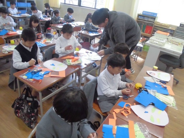 1年生の子どもたちが画用紙をはさみでチョキチョキ、のりでペッタンペッタん…なんだろね。何を作ってるの…聞いてみたら…「おに!」「おにを作ってるの!」と返ってきました。なるほど、確かにちょっと怖そうです。1年生の子どもたちが考えた鬼は少し怖そうで、でもちょっとユーモラスです。これは紙版画の原版を作っているところです。紙版画にすると子どもらしい個性豊かな紙版画ができ上がります。「鬼の顔」は題材としてピッタリかもしれません。これからの時期は節分もひかえているので、ちょうどいいですね。「鬼は外ー、福は内ー!」…しっかり退治できるように、怖そうな鬼をたくさん作ってくださいね。