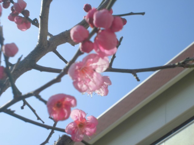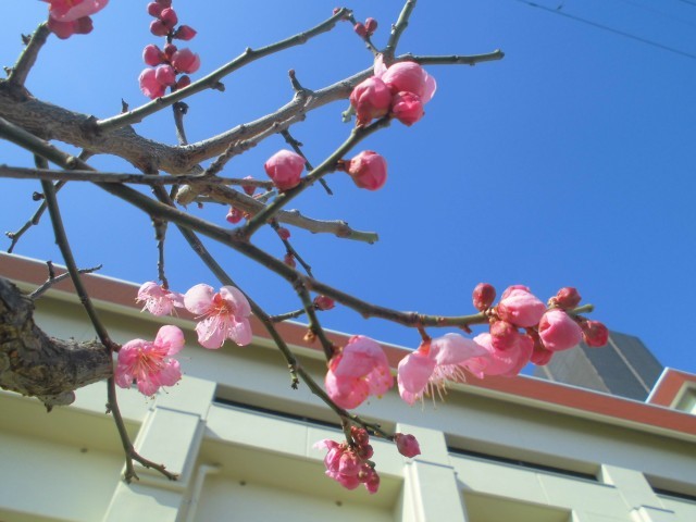 校舎裏に小さな梅の木があります。その梅の木ですが、2月に入り立春を前にして、小さなつぼみをふくらませて、いくつかは淡い桃色の花を咲かせています。まだまだ寒さが厳しい中ですが、春の訪れを感じさせてくれています。