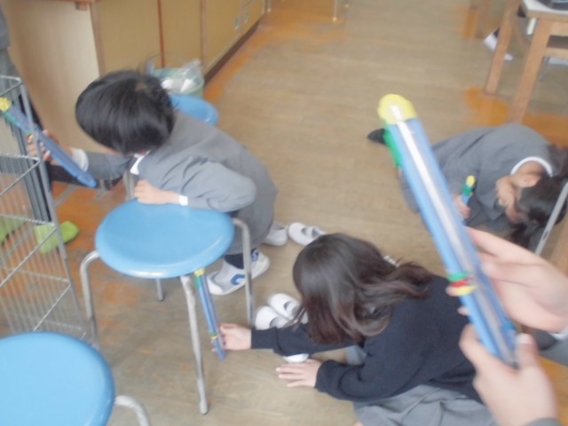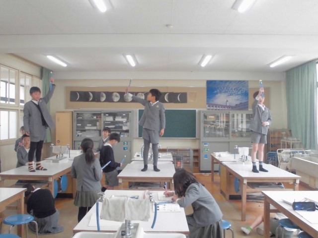 「机の上の乗ったらあぶないよ」…4年生の理科授業の一コマです。何をしているのかな…「空気はどのように温まっていくのだろうか」…決して子どもたちは机の上にのぼってふざけているわけではありません。暖房を入れている部屋で上の方と下の方の空気の温度を測っているのです。結果はどうなったのかな…どのグループの結果もわずかに1~3℃ほど上の方が温度が高かったです。空気も水と同じように、温められた部分が上に動いて全体が温まっていくことがわかりました。エアコンで部屋を温めたいときには風向きはどこに向けるのが効果的なのかな…「下の方に向けたら部屋全体が温まりやすいと思う」…その理由は…「風向きを上に向けるとなかなか温かい空気が下におりてこないけど、下向きにするとまず下の方を温めてから少しずつ上に上がっていって部屋全体が温まると思うから」…きちんと説明できる4年生の子どもたちでした。