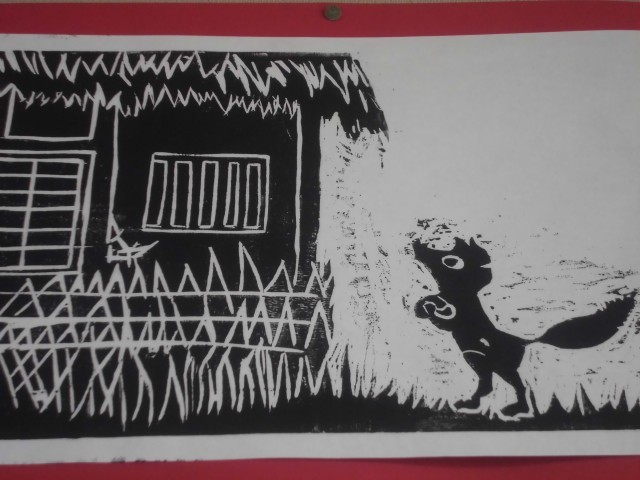 4年生の子どもたちは国語の学習で「ごんぎつね」の勉強をしました。「ごんぎつね」は誰もが一度は読んだことがある、また読んだら忘れない作品の一つです。教科書にも長きにわたってずっと載っています。いたずら好きな、でも心優しいきつねのごんが最後には兵十に火縄銃で撃たれてしまいます。物語を読んで多くのことを想像したり心情を動かしたりすることができる作品です。子どもたちは感じたことを頭に思い浮かべながら版画にしました。そういう視点で子どもたちの作品を見てみると、一つの作品の中に子どもたちの思いや考えも込められているように見えてきます。