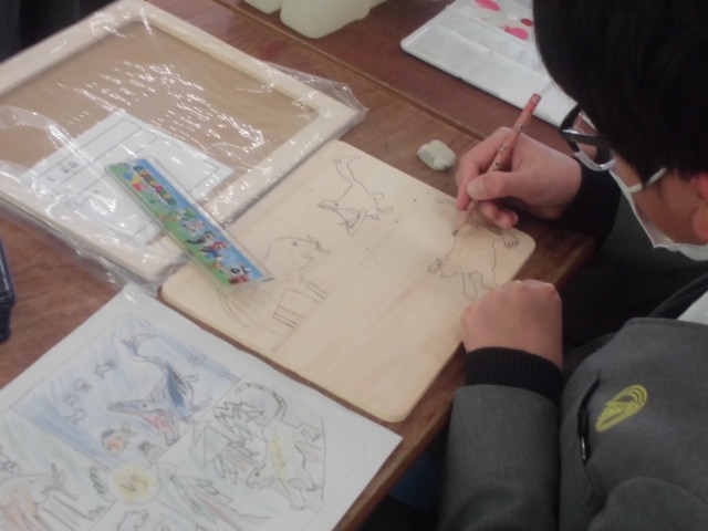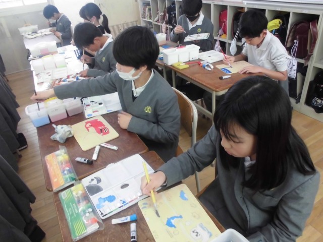 5年生の子どもたちは今、図工でパズルづくりに取り組んでいます。まずは板に絵を描きます。テーマは特に決まっていないようで、みんな思い思いの絵を描いていました。下書きができたら絵の具で色を塗っていきます。そのあとには図工室で電動のこぎり、通称「電のこ」でパズルのように板をカットしていく手順となっています。今日の5年生はみんな楽しくおしゃべりしながら作業を進めていました。いい意味でのおしゃべりです。集中して静かに取り組むのもいいですが、たまには午後のまったりした時間におしゃべりもいいものです。ついついみんなで会話もはずみます。5年生の子どもたちの仲の良さや和やかな関係性を感じることができて、ついつい長居してしまいました。