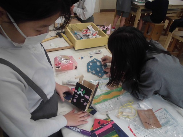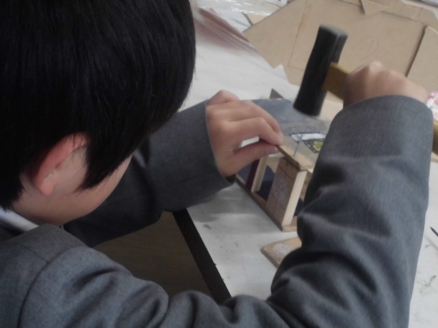 ギコギコ トントン ギコギコ トントン 図工室から何やら音が聞こえてきます。のぞいてみると4年生の子どもたちでした。板材をのこぎりでギコギコ切って釘やボンドでトントンくっつけて、何を作っているのでしょう。メッセージボードやフォトフレーム、小物入れやペン立てなど、いろいろ楽しそうなものが作れそうです。少しずれてはみ出したり左右のサイズが合わなかったり…、そこはご愛嬌です。子どもらしい作品が出来上がっていました。こういう工作も小学生っぽさを感じていいですね。