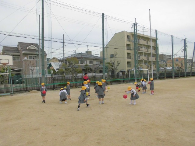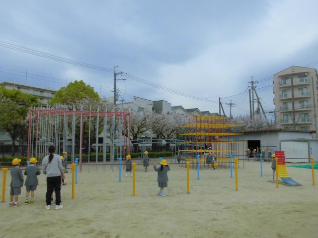 1年生が今日初めて運動場に出て遊びました。