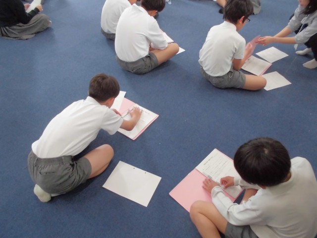 今日の15分休み、集団登校・集団下校の班長が集まって明日の打ち合わせをしました。