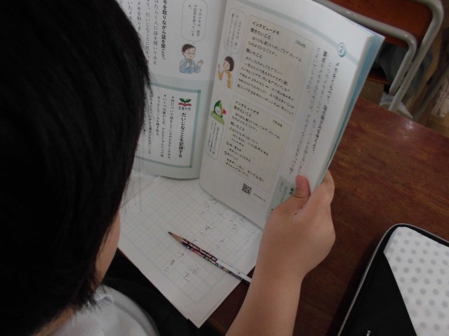 教科書にある2つのメモを読み比べ、話の聞き方を考えます。
