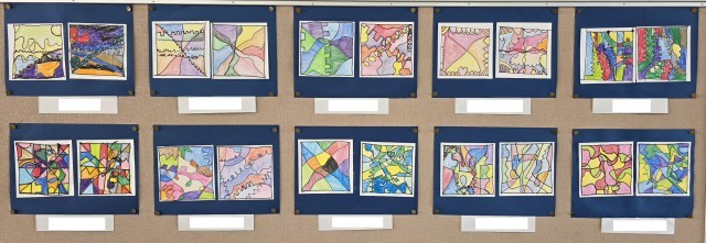 いろいろな線を生かして、デザインしたものに色鉛筆で彩色しました。