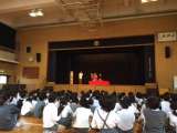 落語を聴く会の様子です。児童の代表が前に出て、演技指導を受けました。