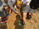 5年生が運動場で流れる水の働きについて実験しています。川の曲がっているところの両...
