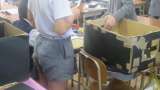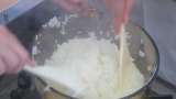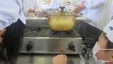 5年生が調理実習をしていました。ごはんを炊いて、みそ汁を作ります。ごはんはガラス...