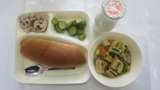 今日の給食のメニューは、中華煮、れんこんのオイスターソース焼き、きゅうりの辛み漬...