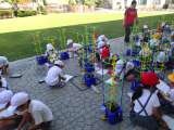 梅雨の合間の晴れの日に、玄関広場で1年生が担任の指導を受けながら自分のアサガオに...