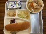 今日の給食のメニューは、いか天ぷら、フレッシュトマトのスープ煮、キャベツとコーン...