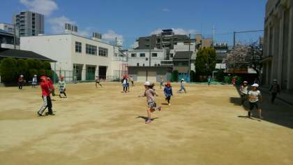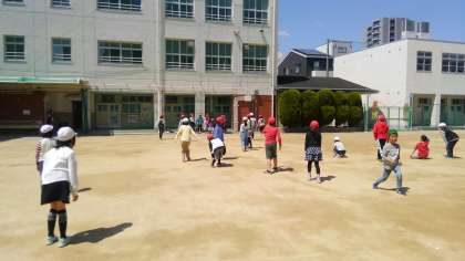 3時間目、4年生が運動場で、いろいろなバージョンのふえおにやだるまさんがころんだをしていました。みんな楽しそうでした。
