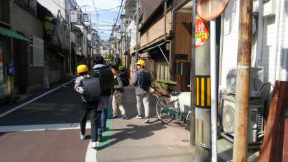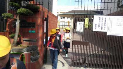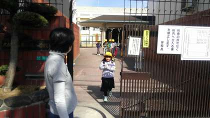 担任の先生が正門まで見送り、途中の道では、地域の方々に見守っていただいています。
