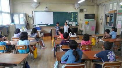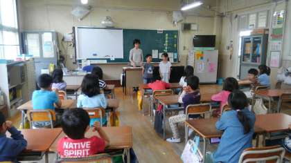日直さんが前に出て、休みの日の思い出をみんなに話して、友だちの質問に答えていました。